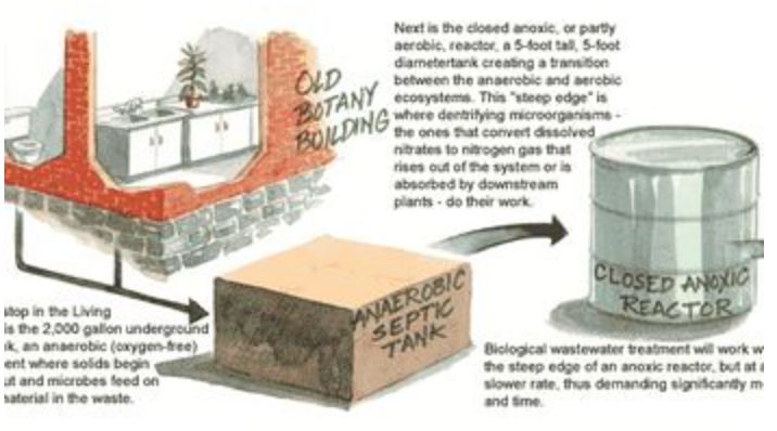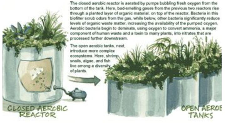 回收站对收到的“地沟油”进行污水处理,用一种“Living Machine”生态系统分解污水。