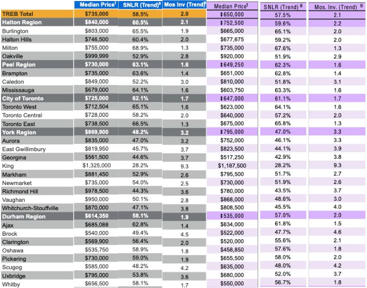 可以看到库存月数方面,多伦多地区和密西沙加所在的皮尔区为最低,售挂比最高,显示市中心和皮尔区继续去年的供不应求状态。